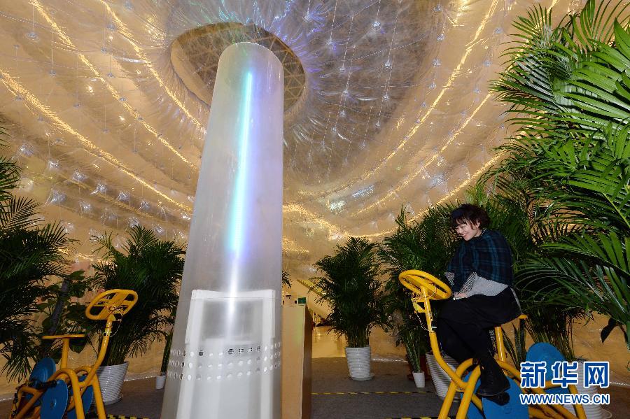 12月15日,一位女士在“生态智能氧泡”里体验。这个装置使用健身单车发电,将产生的电量输送到一个蓄电池中,再供给中央的空气净化器,通过净化器清洁空气;氧泡里布满绿色植物,进一步净化空气。当日,拒绝雾霾全民创意行动周正式在北京拉开序幕,活动将持续至12月20日。活动周内容共三部分:中国雾霾主题环保公益海报展、“生态智能氧泡”人力发电造鲜氧群众运动会,以及全民跨年屏气马拉松。这场活动将旨在号召市民共同面对雾霾带来的挑战。新华社记者 陶希夷 摄