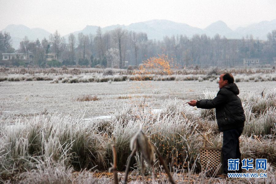 12月12日,管护员给在贵州草海越冬的候鸟投食。 连日来,受强冷空气影响,贵州省威宁自治县出现持续低温凝冻天气,导致草海国家级自然保护区浅滩结冰,候鸟觅食困难,为让在草海越冬的3万多只候鸟平安过冬,当地政府及草海管理局紧急调运6吨贮备粮对候鸟进行投食,确保候鸟有食可吃,安全过冬。 新华社发(何欢 摄)