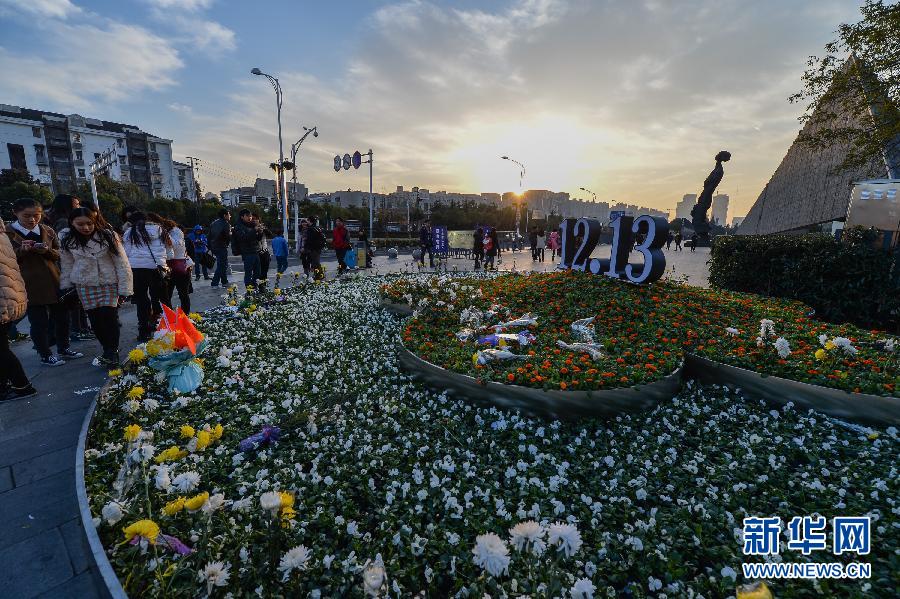 12月14日,观众在侵华日军南京大屠杀遇难同胞纪念馆前的“12·13”花坛上摆放鲜花祭奠遇难同胞。新华社记者 沈鹏 摄