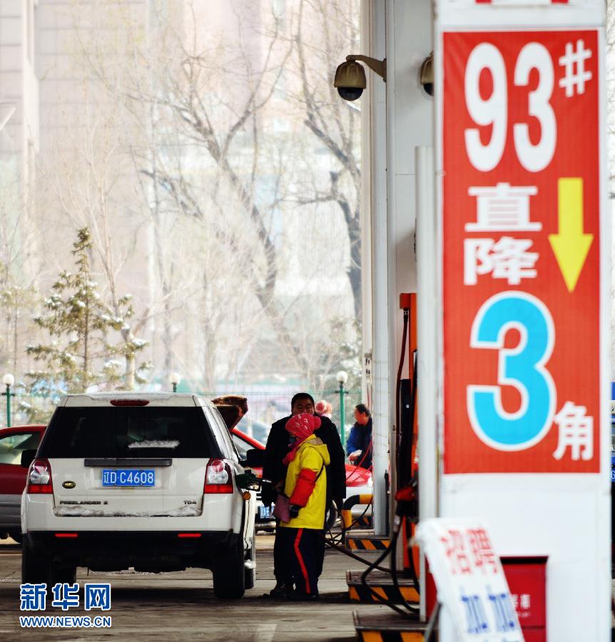 12月12日,在沈阳一家民营加油站打出了93号汽油油价降3角的宣传牌。当日,继11月29日起今年首次上调成品油消费税后,成品油消费税再次提高,但恰逢罕见力度的油价再次下跌,此次调整后国内柴汽油价格仍会下降。财政部、国家税务总局当日联合下发通知,自2014年12月13日起,将汽油、石脑油、溶剂油和润滑油的消费税单位税额每升提高0.28元,由现行每升1.12元提高至1.4元;将柴油、航空煤油和燃料油的消费税单位税额每升提高0.16元,由现行每升0.94元提高至每升1.1元。航空煤油继续暂缓征收。新华社记者 杨青 摄