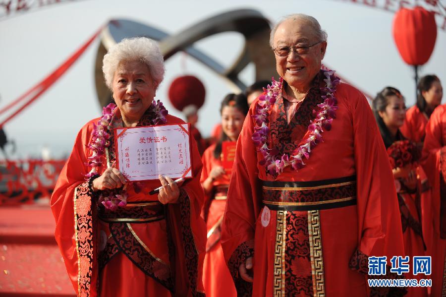 12月12日,表演艺术家谢芳(左)携着老伴张目向大家展示刚刚签署的“爱之印证”爱情证书。当日,第18届中国三亚天涯海角国际婚庆节在天涯海角游览区开幕。50对身着汉服的新人踏着红地毯步入景区,互行执手礼、结发礼等仪式,上演了一幕浪漫的汉式集体婚礼。新华社记者夏一方摄