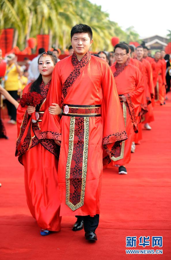 12月12日,身着汉服的新人依次步入活动现场。当日,第18届中国三亚天涯海角国际婚庆节在天涯海角游览区开幕。50对身着汉服的新人踏着红地毯步入景区,互行执手礼、结发礼等仪式,上演了一幕浪漫的汉式集体婚礼。新华社记者夏一方摄