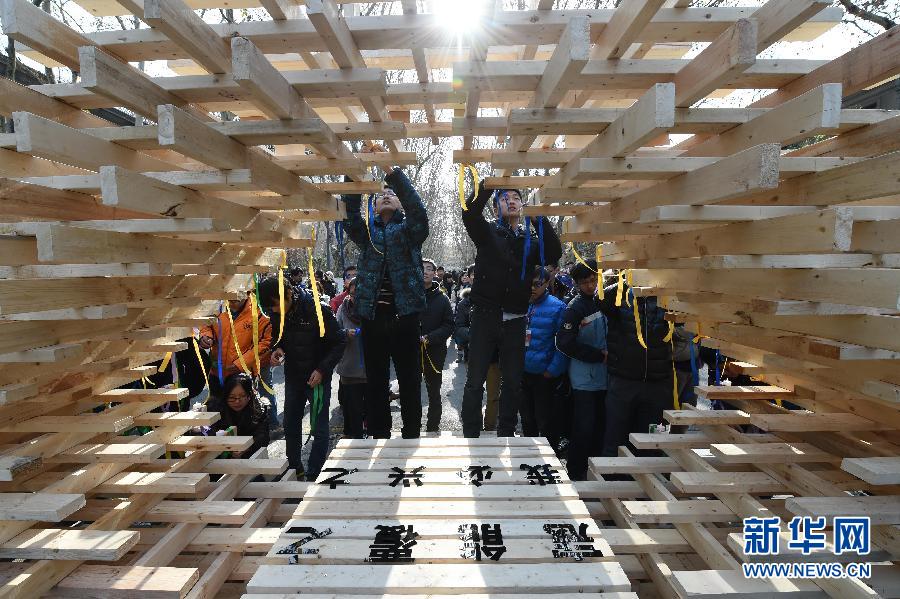 12月12日,学生们在“覆兴坛”上系丝带、摆蜡烛。当日,江苏南京东南大学师生在校园举行“勿忘国耻,圆梦中华”——南京大屠杀死难者国家公祭日主题纪念活动。该校建筑学院学生根据抗战时期老校长(罗家伦)“寇能覆之,我必能兴之”的名言搭建了一座全木结构的“覆兴坛”,师生们在坛上系丝带、放置电子蜡烛、展示手绘的国家公祭日主题明信片,表达对大屠杀遇难同胞的祭奠和哀思。现场还开展了演讲、国家公祭日主题图片展等活动。新华社记者 孙参 摄