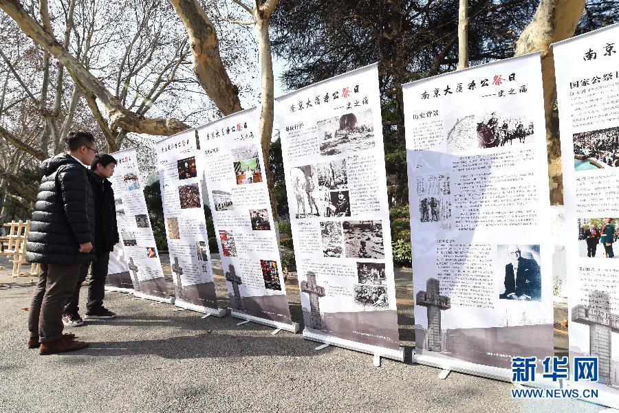 12月12日,学生在参观国家公祭日主题图片展。当日,江苏南京东南大学师生在校园举行“勿忘国耻,圆梦中华”——南京大屠杀死难者国家公祭日主题纪念活动。该校建筑学院学生根据抗战时期老校长(罗家伦)“寇能覆之,我必能兴之”的名言搭建了一座全木结构的“覆兴坛”,师生们在坛上系丝带、放置电子蜡烛、展示手绘的国家公祭日主题明信片,表达对大屠杀遇难同胞的祭奠和哀思。现场还开展了演讲、国家公祭日主题图片展等活动。新华社记者 孙参 摄