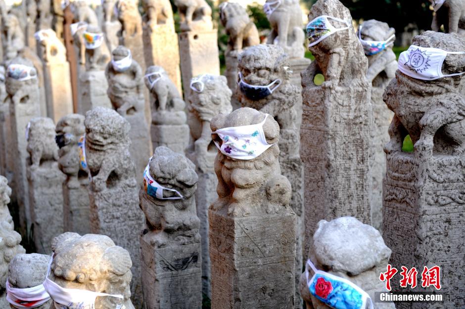 12月12日,在西安美术学院内,近百拴马桩“戴上”了口罩,学生们以此呼吁保卫蓝天抵抗雾霾。张远 摄