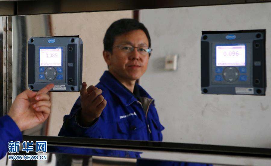 北京自来水集团郭公庄水厂建设办公室工程部部长张周强介绍水处理过程中的浊度等水质监测情况(10月24日摄)。国家生活饮用水卫生标准规定,自来水厂出厂水浊度不大于1.0NTU,现郭公庄水厂测试浊度为0.085至0.096NTU。新华社记者殷刚摄