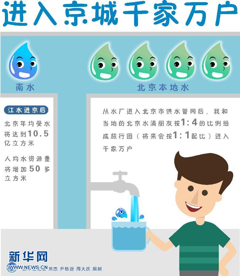 这是南水与本地水源在北京供水管网配比示意图。我是丹江口水库的一滴清水,南水北调中线工程的建成通水让我有机会前往北京旅游。我沿豫西南一路向北,穿过黄河,沿京广铁路西侧北上,蜿蜒自流1000多公里,最终抵达终点——北京。我流过了房山北拒马河渠首,来到南水北调进京唯一“入口”——惠南庄泵站,开启了我的北京之旅。在惠南庄泵站我得到了充分的休息,经8组泵机加压后,我全身充满了能量,进入了两条长50多公里、内径4米的输水管道。在永定河以西的大宁调压池“卸压”休整后,我又精力充沛地钻入地下管涵穿永定河、过丰台区,沿西四环一路北上。旅行途中,我时而与北京四环的车流并肩而行,时而与同在地下穿行的地铁擦肩而过,经过80公里的地下旅程我跃出地面来到颐和园的身畔——团城湖明渠。全长885米的明渠让我饱览了京城园林风光,明渠旁的团城湖调节池连接密云水库和南水北调两大水源,不仅能把水源配送至各水厂,还能把富余的水源补充至密云水库。为迎接南水进京,北京市内配套工程新建、扩建的11座供水水厂覆盖全市。进入水厂后,经过严格的净化处理,我的身体检查合格,成为符合国家饮用水标准的自来水,被输送至全市供水管网,并在这里和当地的北京水滴朋友按1:4的比例组成旅行团,最终进入北京千家万户。新华社发