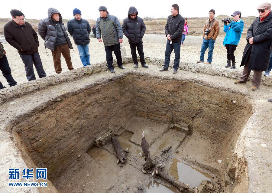 12月19日,文物考古专家、学者在江苏省盱眙县淮河镇城根村泗州城遗址勘查。当日,来自全国各地的文物考古专家、学者汇聚江苏省淮安市盱眙县,对盱眙境内的泗州城遗址考古发掘、文物保护工作进行研讨,一大批珍贵的文物与各地的专家学者见面。因洪水肆虐而被深埋水下330多年的“东方庞贝”泗州城,经过南京博物院考古所三年多的考古发掘,已确定了古泗州城遗址范围,一大批珍贵的文物“重见天日”。新华社发(周海军 摄)