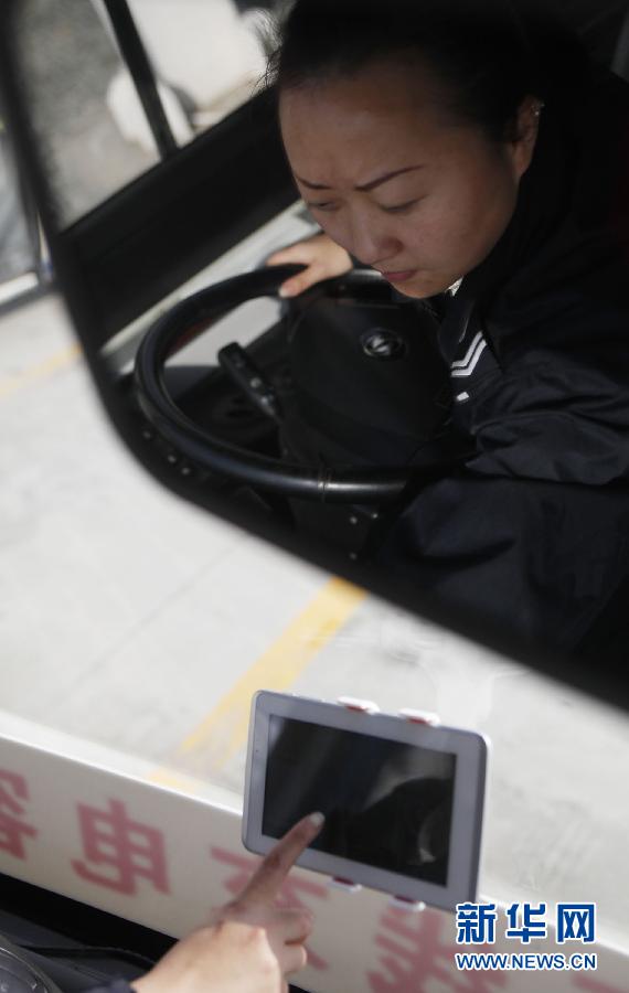 在湖北襄阳高新区公交车站车场,驾驶员操作平板电脑对公交车进行无线充电(12月8日摄)。