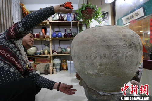 12月19日,郑州市古董收藏爱好者凡先生在为一件巨型大陶瓮测量大小。 杨正华 摄