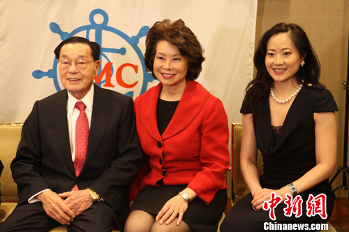 12月19日,美国福茂船运集团举行成立50周年庆典。左一为集团董事长赵锡成,中间为美国前劳工部长赵小兰,右一为集团副董事长赵安吉。邓敏 摄