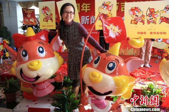 领衔该设计的中国著名设计师方芳与“中国年·春节吉祥物”合影 潘索菲 摄