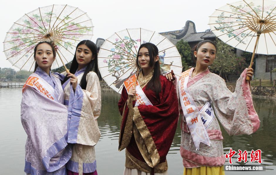 12月19日,正在广州参加美丽之冠2014世界休闲小姐大赛中国年度总决赛的70个城市的佳丽,来到东莞寮步镇影视城进行拍摄,图为参赛佳丽展示风采。中新社发 钱兴强 摄