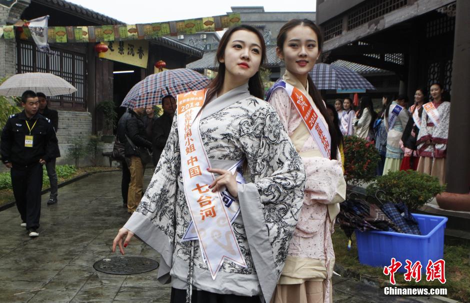 12月19日,正在广州参加美丽之冠2014世界休闲小姐大赛中国年度总决赛的70个城市的佳丽,来到东莞寮步镇影视城进行拍摄,图为参赛佳丽展示风采。中新社发 钱兴强 摄