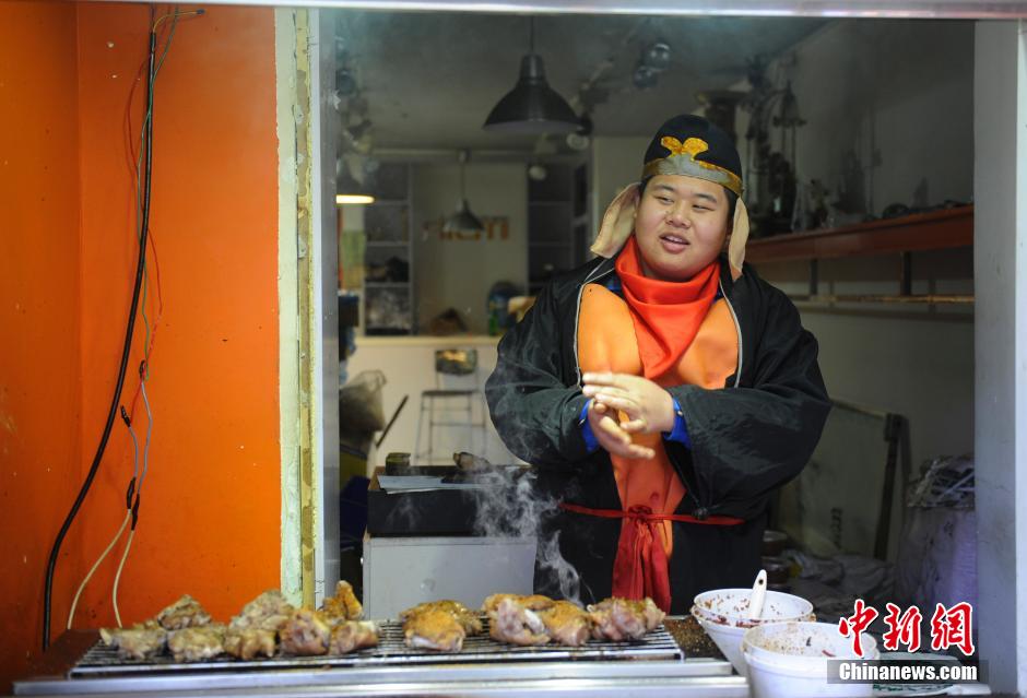 12月19日,一身猪八戒装扮的“90后”小伙子在吉林街头售卖烤猪蹄,别致的售卖方法吸引大批市民前来购买。中新社发 张瑶 摄