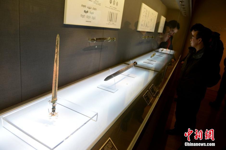 12月19日,“吴钩重辉——苏州博物馆藏吴越青铜兵器特展”在苏州博物馆举办,展览分“吴越争辉”、“耕战并举”、“礼乐化民”、“金戈铁马”四个主题,集中展出吴越地区出土文物达140件/套,展现了“吴越铸剑”的传承源流和高超工艺。图为观众被展出的吴王夫差剑所吸引。 王思哲 摄