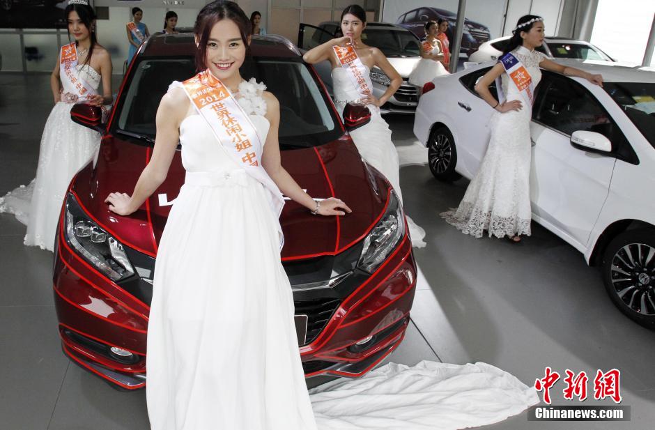 12月18日,正在广州参加美丽之冠2014世界休闲小姐大赛中国年度总决赛的70个城市的佳丽,在广州参加婚纱秀、车展、游览珠江等系列拍摄及公益活动。图为参赛佳丽展示风采。 中新社发 钱兴强 摄