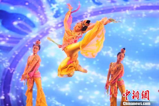 12月18日晚,敦煌壁画舞姿与西方芭蕾舞同时亮相兰州舞台,这场中西方舞蹈艺术“碰撞”的视觉盛宴令人如痴如醉。图为群舞《敦煌天女》表演。 杨艳敏 摄
