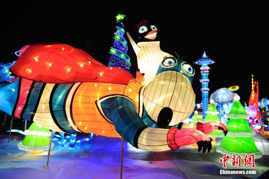 12月18日晚,深圳大型动漫主题灯会在欢乐海岸椰林沙滩璀璨开幕,飞行的超人贝肯熊、巨大的水母、年代记忆等50多个主题彩灯向游客展现生动有趣的故事,本届灯会将横跨圣诞、元旦、春节、元宵等五大节日。中新社发 陈文 摄