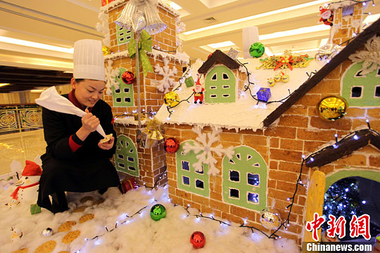 12月18日,江西省瑞昌市一酒店用1001块姜汁饼干做成了一个高2米、宽3米的圣诞姜饼屋,为即将到来的圣诞节营造出浓厚的节日气氛。中新社发 魏东升 摄