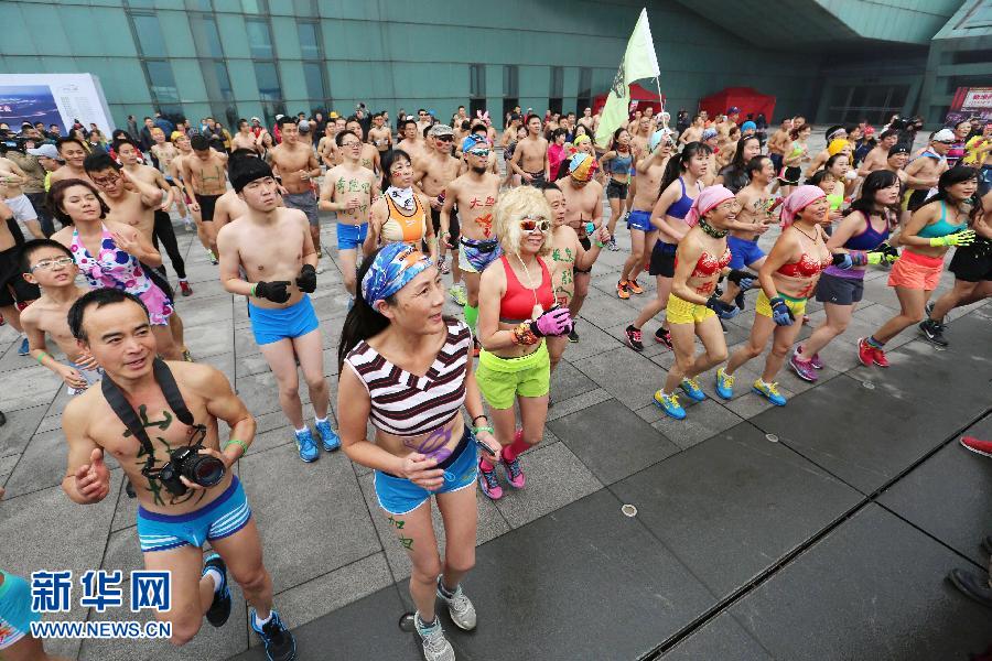 12月21日,参加者在户外参加“光猪跑”活动。当日,一场“光猪跑”活动在重庆举行,300名参加者仅穿内衣,在低温环境下跑完5公里路程,迎接“冬至”的到来。 新华社发(赵俊超 摄)