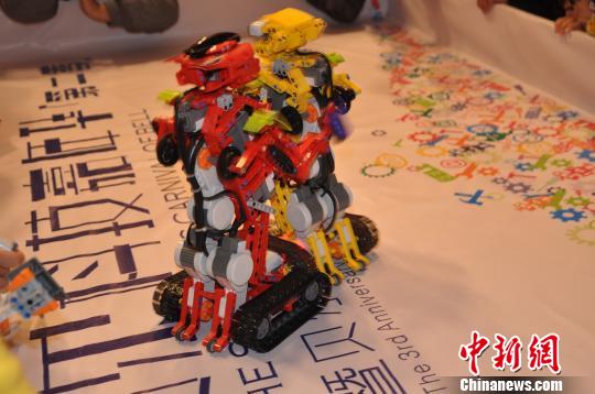 贝尔科技嘉年华上展出的由积木打造的机器人,是国内功能最完善,外形最独特,运行最稳定的拳击机器人。 江峡 摄