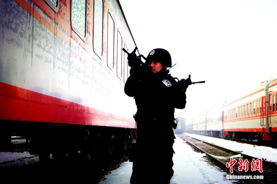 图为特战队员对旅客列车车厢外进行定点清理。 李国贤 摄