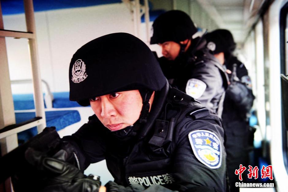 图为特战队员对旅客列车卧铺车厢车体连接处死角进行快速射击处置。 李国贤 摄