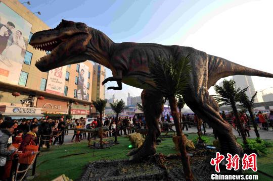 12月21日,仿真恐龙模型吸引了许多市民前来观赏。为了在圣诞节来临前营造节日氛围,以吸引消费者,一组大型仿真恐龙模型亮相福州一商场。 张斌 摄