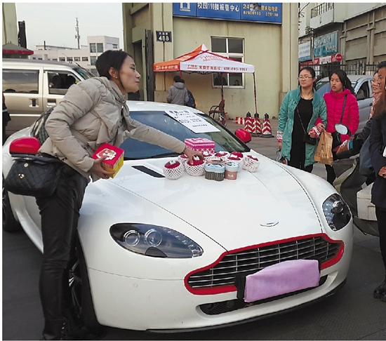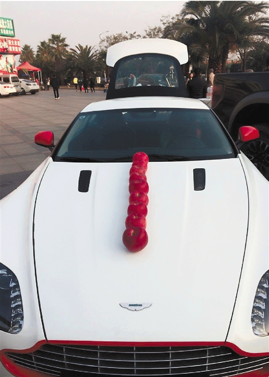 400多万的阿斯顿马丁,200多万的玛莎拉蒂,保时捷911,100多万的悍马……在宁波大学北区学生二村的门口,五六辆豪车排成一列,比较特别的是,每辆车的前盖上都放着一个个包装精美的红苹果。