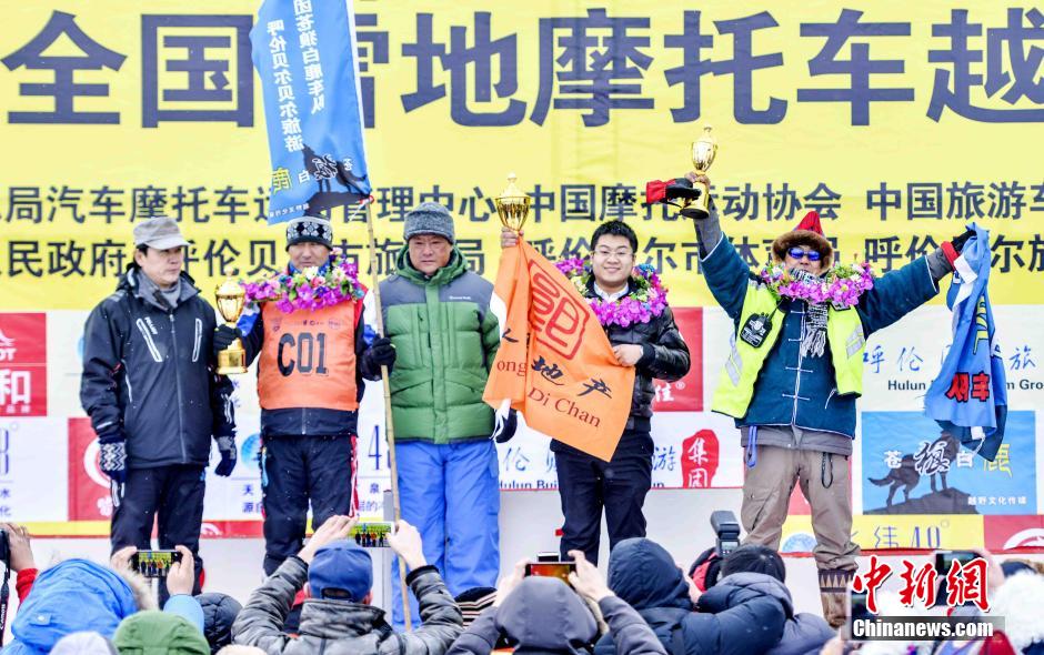 2014“皆佳”杯全国雪地摩托越野挑战赛12月22日在内蒙古呼伦贝尔海拉尔东山滑雪场落下帷幕,来自全国各省市30多支车队的百余名专业车手参加比赛,比赛由国家体育总局汽车摩托车运动管理中心、中国摩托运动协会、中国旅游车船协会、内蒙古自治区体育局、呼伦贝尔人民政府主办,海拉尔区人民政府、呼伦贝尔市旅游局、呼伦贝尔旅游集团有限公司、北京冰雪双威力体育设施公司共同承办。中新社发 赵振清 摄