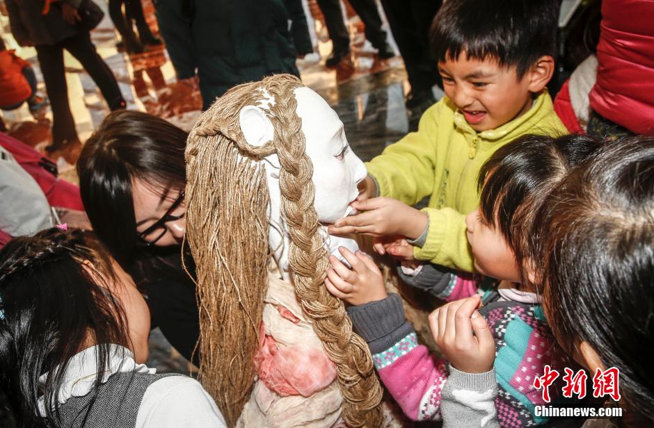 12月22日,国家大剧院一年一度的“公众开放日艺术节”如约而至,图为几名小观众好奇地摸着长相酷似外星人的提线木偶。当日,大剧院在北京为观众奉上长达8小时的艺术盛宴,总计安排12场演出、近50场空间表演、7场艺术家沙龙、9大系列艺术展览等共计70余场的艺术活动。中新社发 张浩 摄