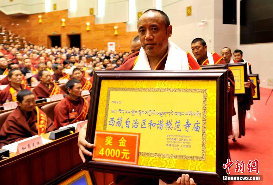 12月22日,西藏官方在拉萨举行会议,表彰2014年度和谐模范寺庙、爱国守法先进僧尼。 西藏哲蚌寺等160座寺庙,丹增格桑等8818名僧尼获表彰。在此间的会上,还表彰了2014年度西藏自治区158个先进寺庙管理委员会、900名优秀驻寺干部和100名宗教工作优秀干部。李林 摄