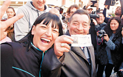 中新网12月23日电 据香港《文汇报》23日报道,西班牙一年一度的圣诞彩票ElGordo(意为“肥仔”)22日开奖,全国民众凝神观看长达4小时的搅珠过程。这项总派彩金额全球最高的彩票以“人人有份,均分财富”为宗旨,虽然今年每注头奖彩金只有40万欧元,但有数千注可赢得不同金额的彩金,让西班牙人暂时忘却经济忧虑,开心过圣诞。