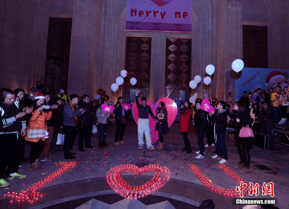 12月24日平安夜晚上,在武汉光谷德意风情街上的教堂前,挂着一幅长30米宽8米的巨幅横幅上写着六个字“杨丽娜嫁给我”,引来不少市民观看。这是一位武汉小伙彭毅进行的求婚行动,最终在现场数百位市民的见证下,女友流着泪答应了他的求婚。中新社发 张畅 摄