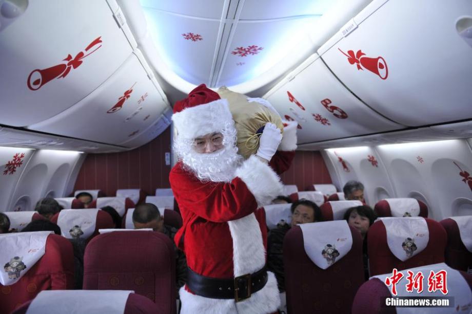 空乘着“圣诞装”万米高空派发圣诞礼物