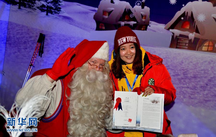 12月25日,一位游客在敖鲁古雅鄂温克民族乡与来自芬兰的“圣诞老人”合影。当日,第二届中国冷极节在有“中国冷极”之称的内蒙古根河市举行。数百名游客冒着严寒走进山林,体验敖鲁古雅鄂温克族游猎生活,与驯鹿亲密接触,参加冰雪游乐活动,举行篝火晚会,欢度圣诞。新华社记者 任军川 摄