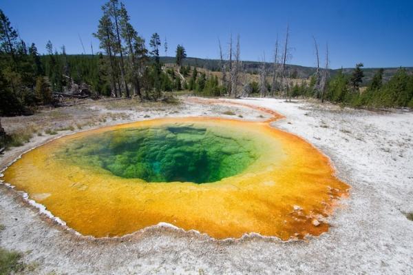 在黄石公园一个名为“牵牛花池”的温泉池,研究人员能够重塑池水于1880年代到1940年代的色彩,当时水温比现在高出许多,水色有着如一的深蓝色。但数十年来累积在池中的垃圾、钱币和石头,降低了池水温度,颜色也转变成橘、黄和绿色。