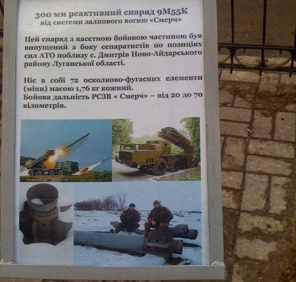 展板上的信息对此枚火箭弹的来源做了说明,指出其可能是来自俄罗斯研制的“龙卷风”远程火箭弹武器系统,但配图中出现了一张疑似中国军队300毫米远程火箭炮发射的画面。