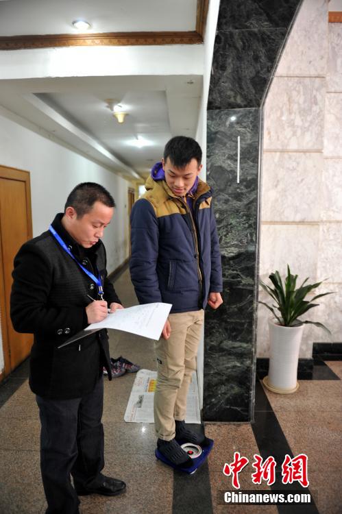 飞行员,作为一个特殊的职业,是许多人眼中的“天之骄子”,而对于他们来说,体检是每一位梦想成为飞行员必不可少的一道门槛。为保证空中运输的安全和质量,历届飞行员的招收对体检的把关都是非常严格的。除了对视力、身高、体重都有严格控制,还要现场脱上衣查看是否有疤痕。今年,中国东方航空公司首次在江西省一次性招收飞行员50名。12月22日,在东航江西分公司一楼大厅,来自江西省各地考生冒着严寒聚集于此,进行身高、体重、视力、外科等体检项目。图为一名报考学员正在测量体重,一般体检要求体重在54至79公斤之间。 刘占昆 摄