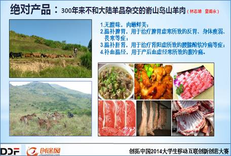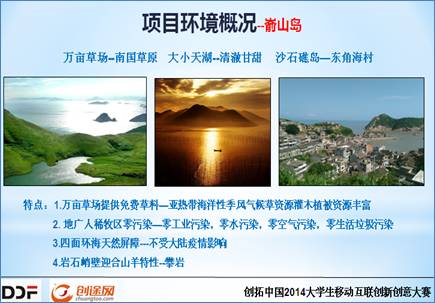 我们的项目创意规划是开通可视化网络,包括APP和微信服务号来运营,让用户和养殖基地通过视频互动起来。我的第一个设想是在山上选特定的位置安装视频摄像头,让城里的小朋友和我们编号的小羊等动物结对子做朋友,利用摄像头,小朋友每天可看看自己的山羊,看看它的生活过程和成长情况。周末和假期了,家长可以带着小朋友一起来海岛现场体验,看看与自己一起成长的小羊。通过这种线上线下方式体验亲子趣味教育,寓教于乐。另外通过每天开通着直播摄像头,让用户可以看到我们海岛的美丽风光和四季的变化,远程观望海岛风平浪静时的水天一色,风暴到来时的汹涌澎湃。用户还可以感受渔民的生活和大海的壮阔。第二个设想是利用定位器给羊群定位,因为海岛山羊是放养为主容易走失,有了定位器,我就可以随时找回这广阔的版边上走失的羊。