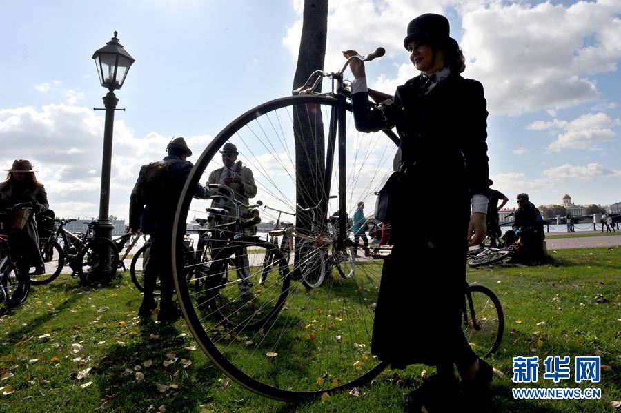 9月13日,在俄罗斯圣彼得堡举行的“粗花呢骑行”活动期间,一名女士身穿复古服装站在一辆老式自行车旁。 新华社/法新