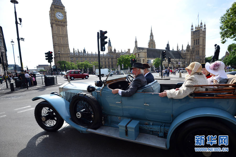8月4日,在英国伦敦市中心,退伍老兵乘坐一战期间的古董汽车参加纪念英国参加第一次世界大战的游行。 新华社/法新