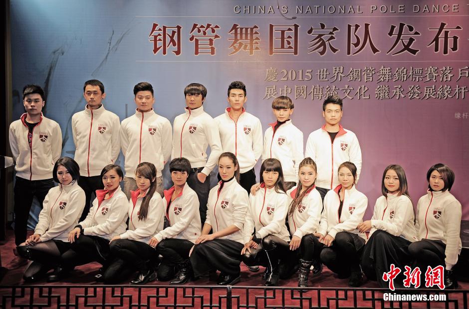 12月28日,新一届钢管舞国家队成员发布会在天津举行,通过中国钢管舞锦标赛的选拔,新晋4名新队员,分别是女队员罗琳琳、杨丽和男队员舞鑫、柯宏。至此,钢管舞国家队成员共18名,包括11名女队员和7名男队员。随后,队员们将集中特训及参加钢管舞国家队的资格赛,为2015年钢管舞世锦赛选拔代表。佟郁 摄