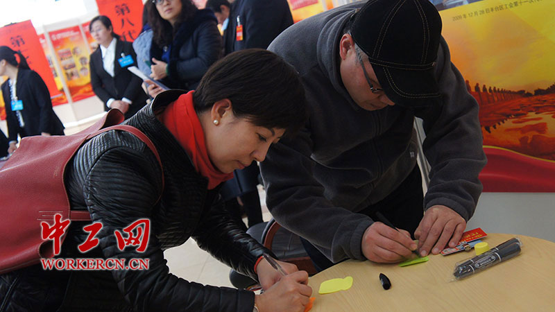 图为参会代表为丰台区工会第十二次代表大会书写寄语。中工网记者 葛姗 摄