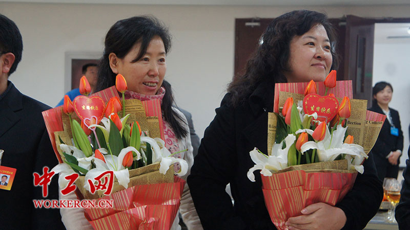 丰台区总工会特意为过生日的代表送上了郁金香花束。中工网记者 葛姗 摄