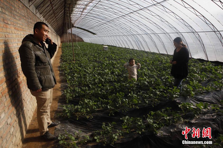 图为唐玲国在自己的草莓大棚接听网络销售的客户电话时,在老家的亲戚也打电话过来,询问他的小家好不好,春节是否回老家过年。 中新社发 杨可佳 摄
