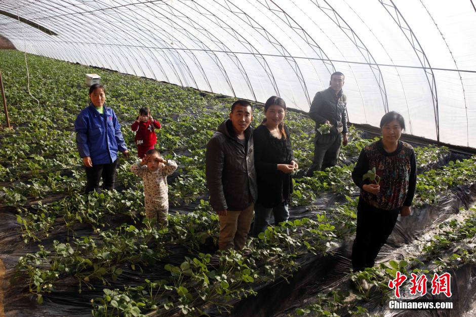 图为唐玲国和亲人在自己的草莓大棚间合影留念。 中新社发 杨可佳 摄
