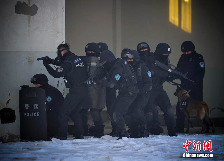 12月29日,新疆乌鲁木齐市公安局特警八支队举行反劫持演练,模拟突发事件“歹徒”持手枪、砍刀等劫持多名“人质”,躲避在一废弃厂区内,特警八支队接到报警后,迅速出动并根据现场地形分工协作,狙击手远距离锁定目标,突击队员左右夹击,快速处置解救“人质”,借此训练特警队员在劫持事件中快速解救人质能力及寒冷天气和复杂环境条件下的快速反应能力。据介绍,该特警队是乌鲁木齐公安队伍中一支快速反应力量,主要职能是处置暴力恐怖犯罪事件、严重暴力性犯罪事件等重大治安事件。方涛 摄