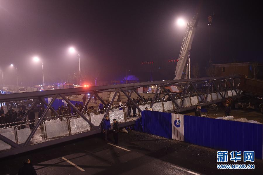 12月29日,救援人员在事故现场施救。当晚,沈阳市东陵西路上一座过街天桥被一辆大货车意外碰撞倒塌,大货车被压导致一名司机受困,车里没有其他乘客。记者在现场看到事发路段已封闭,铁制的部分人行天桥桥体倾倒在马路路面,有关方面派出人员正在紧急施救处理。新华社记者 潘昱龙 摄